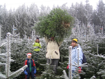 | ... und jeder hilft mit, ihn aus dem Wald zu holen. | Mit Ihnen zusammen bringen wir Ihren Baum auf den Hof. Dort wird er zugespitzt und verpackt, damit Sie Ihn bequem nach Hause bringen können. |
