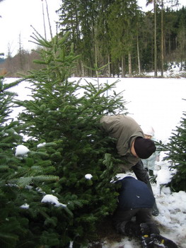 | Sie suchen sich aus dem "Märchenwald" den richtigen Baum aus. | Haben Sie IHREN Baum gefunden, kommt die Arbeit: Jetzt muss er abgesägt werden... |